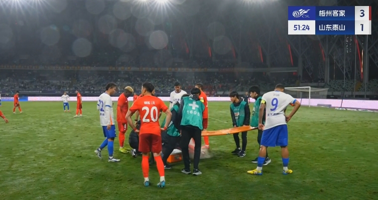 03月29日訊 泰山vs梅州第50分鐘,王彤遠射后為了躲避封堵失去平衡摔地,隨后被擔架抬下。張弛替補登場(chǎng)!