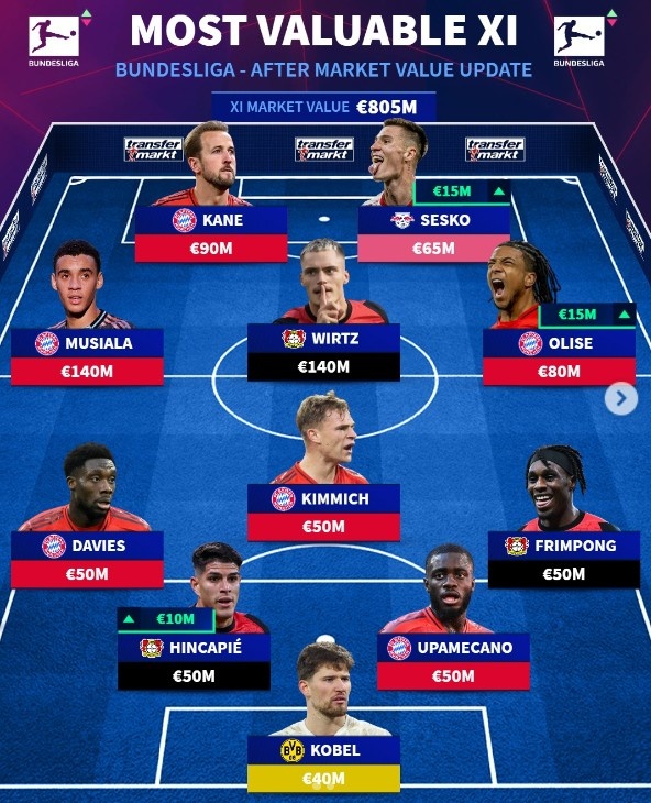 德轉德甲最貴陣:凱恩領(lǐng)銜拜仁6將入選,維爾茨、塞斯科在列