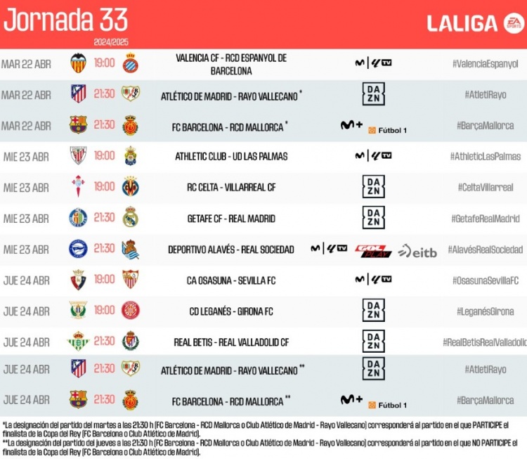 西甲第33輪時(shí)間:巴薩、馬競的比賽時(shí)間視國王杯半決賽結果而定