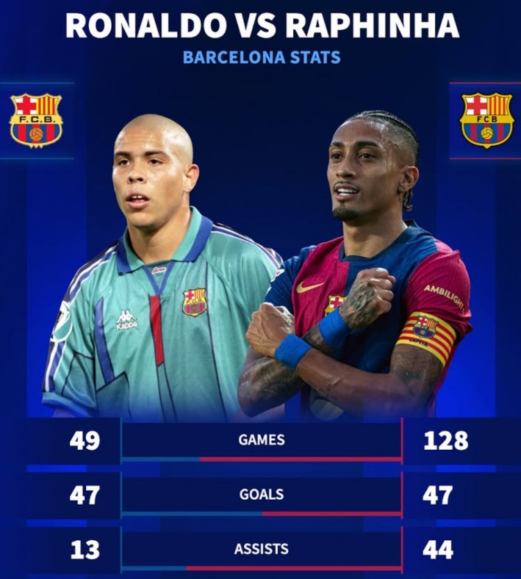 羅納爾多巴薩生涯49場(chǎng)47球,拉菲尼亞進(jìn)球數已追平但多用近80場(chǎng)