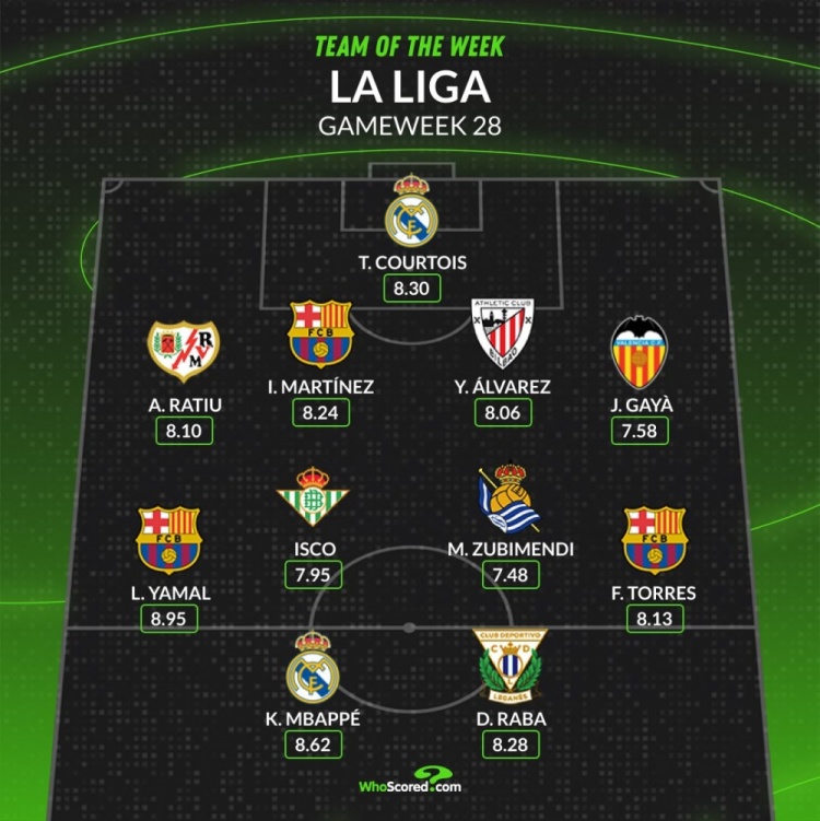 whoscored本周西甲最佳陣:姆巴佩、亞馬爾領(lǐng)銜,費蘭、褲襪在列