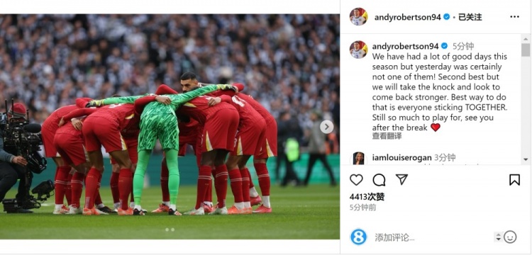 3月17日訊 在北京時(shí)間今天凌晨進(jìn)行的聯(lián)賽杯決賽中,羅伯遜踢滿(mǎn)全場(chǎng),最終利物浦1-2不敵紐卡,無(wú)緣冠軍。羅伯遜在社交媒體上曬出球員們圍在一起打氣的照片,并寫(xiě)道:“本賽季我們有過(guò)很多美好的日子,但昨天肯