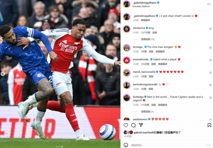 當選全場(chǎng)最佳,加布里埃爾社媒曬照:零封取勝,倫敦是紅色的!
