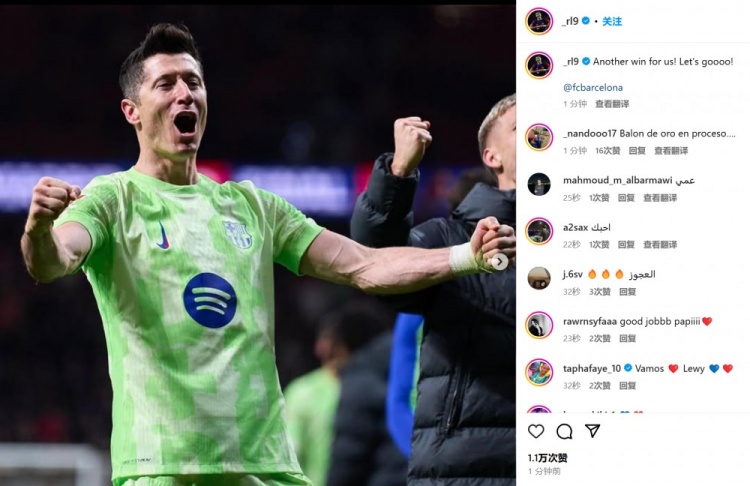 3月17日訊 巴薩在本輪西甲4-2逆轉馬競,萊萬(wàn)為球隊扳回一城。第72分鐘,伊尼戈-馬丁內斯上搶斷球再傳中,萊萬(wàn)多夫斯基胸部停球后凌空掃射破門(mén)。他也在賽后通過(guò)社媒曬出自己的慶祝照,并配文:“又一場(chǎng)勝利