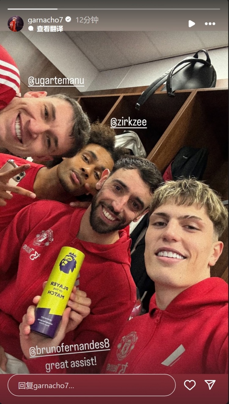 3月17日訊 英超第29輪比賽,加納喬接B費助攻破門(mén),幫助曼聯(lián)客場(chǎng)3-0完勝萊斯特城。加納喬在社交媒體上曬出與B費、齊爾克澤、烏加特賽后的更衣室合照,他手拿B費的全場(chǎng)最佳獎杯,配文:“很棒的助攻?!?/p>