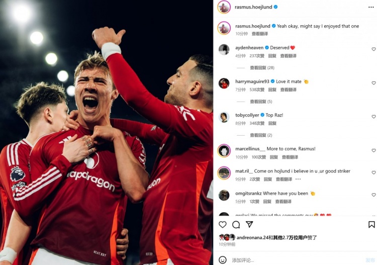 3月17日訊 在本輪英超,曼聯(lián)3-0大勝萊斯特城。本場(chǎng)進(jìn)球的霍伊倫也終結了自己連續21場(chǎng)進(jìn)球荒,賽后他在社媒曬出與隊友慶祝進(jìn)球的合影,配文寫(xiě)道:“好吧,我承認喜歡這種感覺(jué)?!?/p>