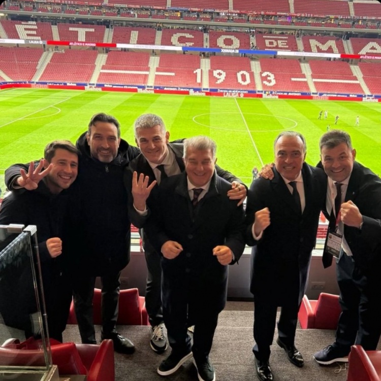 客場(chǎng)逆轉繼續領(lǐng)跑積分榜!拉波爾塔等巴薩高層合影慶祝勝利