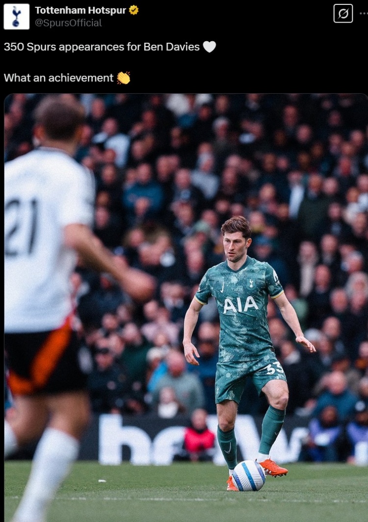 3月16日訊 在本輪英超熱刺對陣富勒姆的比賽中,本-戴維斯為熱刺首發(fā)登場(chǎng)。本場(chǎng)比賽也是本-戴維斯生涯代表熱刺各項賽事第350次登場(chǎng),球隊官推也曬照為其紀念,配文寫(xiě)道:“多么了不起的成就!”本-戴維斯自