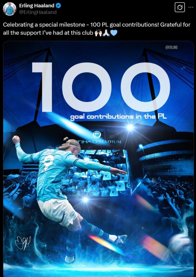 英超參與100球,哈蘭德社媒曬海報:紀念達成這一特殊的里程碑!