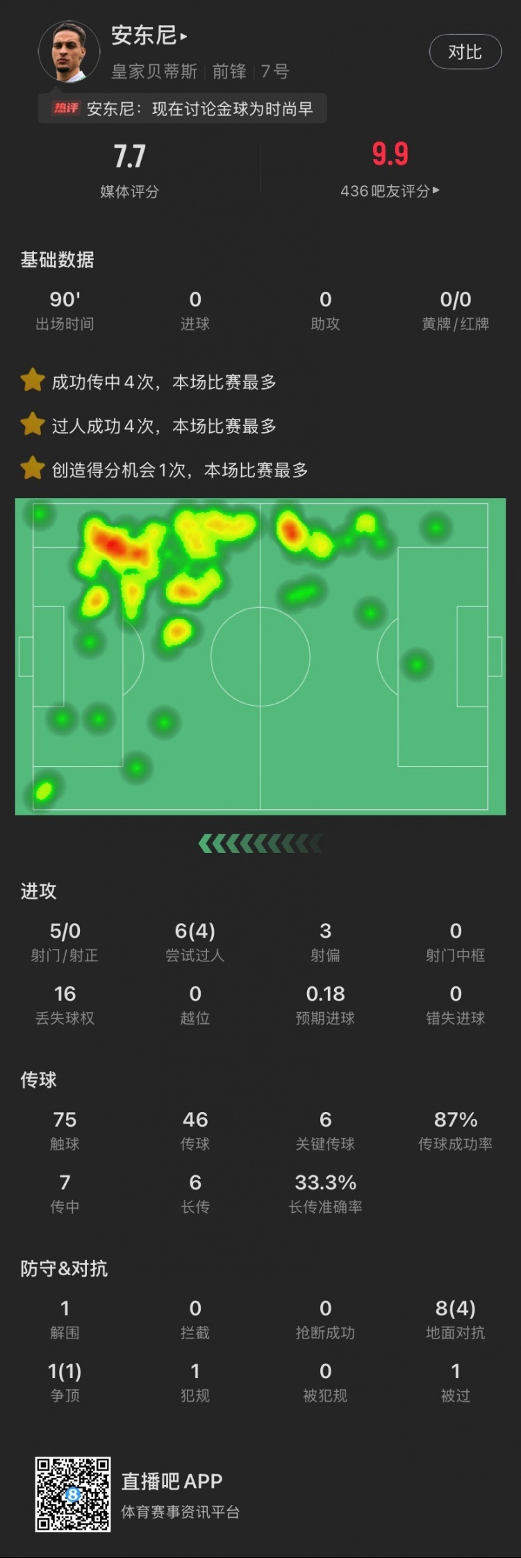 3月16日訊 在剛剛結束的西甲比賽中,貝蒂斯讓二追三逆轉擊敗萊加內斯。本場(chǎng)比賽,安東尼發(fā)揮出色,策動(dòng)逆轉進(jìn)球并多次創(chuàng )造良機,獲評7.7分隊內第三。安東尼本場(chǎng)主要數據↓射門(mén):5射正:0過(guò)人:嘗試6次,成