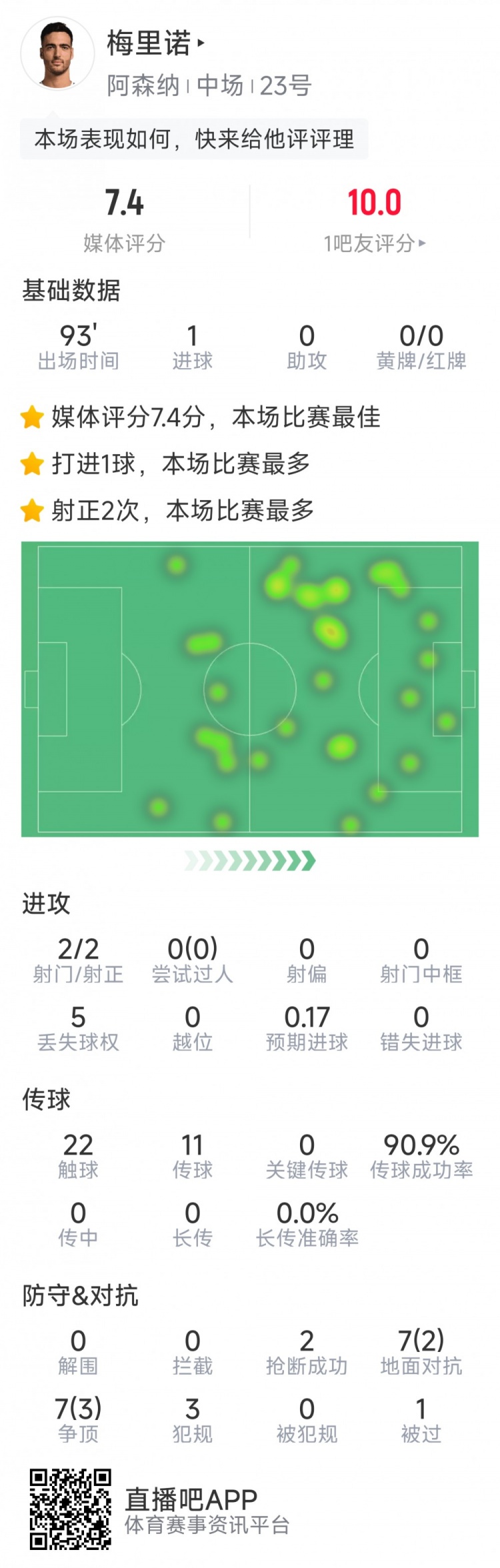 梅里諾本場(chǎng)數據:打進(jìn)全場(chǎng)唯一進(jìn)球,2次射門(mén)均射正,2次搶斷