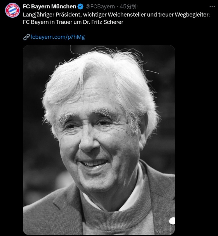 拜仁官方悼念前俱樂(lè )部主席弗里茨-舍勒去世,享年85歲