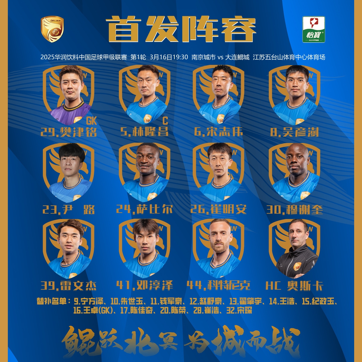 南京城市vs大連鯤城首發(fā):雙外援PK三外援,穆謝奎出戰