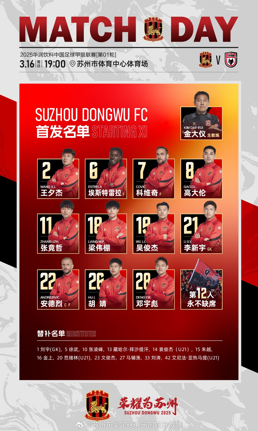 03月16日訊 北京時(shí)間19點(diǎn),2025賽季中甲首輪,蘇州東吳主場(chǎng)迎戰陜西聯(lián)合,賽前官方公布兩隊首發(fā)。蘇州東吳首發(fā):21-李新宇、2-王夕杰、11-張競哲、22-安德烈(F)、26-胡靖、6-埃斯特雷