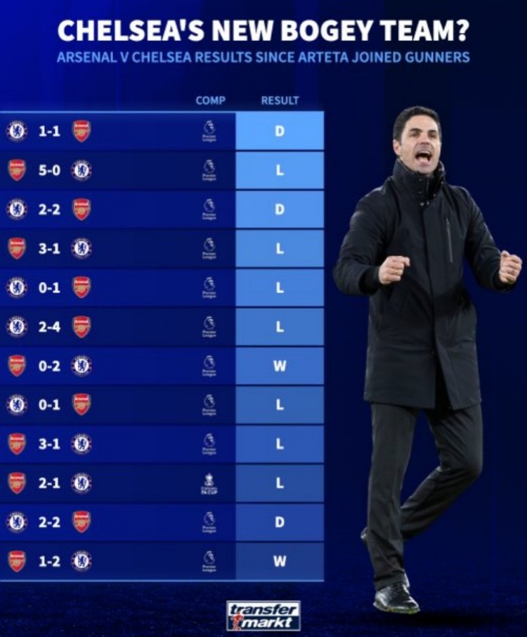自阿爾特塔執教阿森納12次對陣切爾西只輸兩場(chǎng),近6場(chǎng)4勝2平
