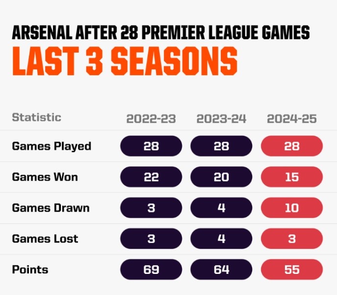 阿森納本賽季28輪英超積55分,比前兩個(gè)賽季同期分別少9分&14分