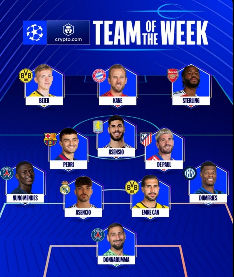 歐冠官方本輪最佳陣:凱恩領(lǐng)銜,佩德里、斯特林、多納魯馬在列