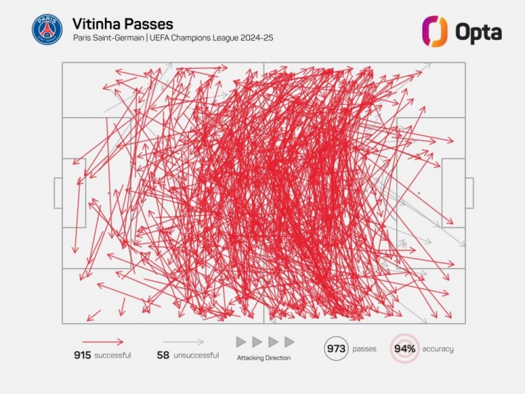 維蒂尼亞單賽季歐冠成功傳球已915次,近21年中場(chǎng)僅哈維等4人做到