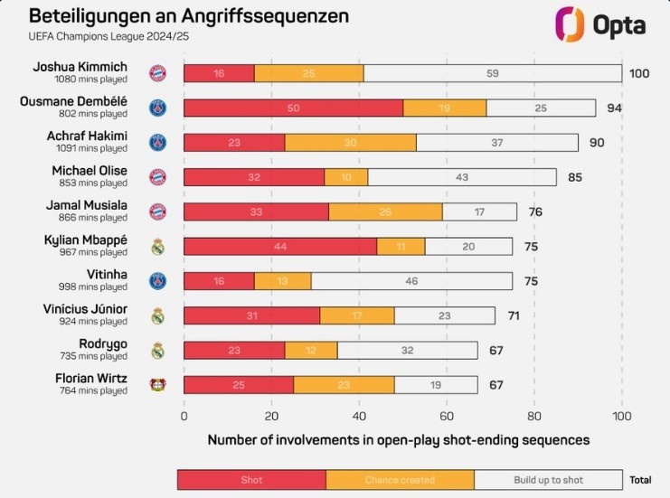 基米希本賽季歐冠100次參與形成射門(mén)的進(jìn)攻,領(lǐng)跑所有球員