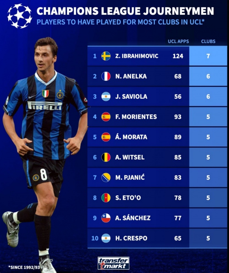 3月14日訊 轉會(huì )市場(chǎng)盤(pán)點(diǎn)了歐冠改制以來(lái),球員代表最多不同球隊參賽次數榜,伊布共代表7支球隊參賽居首,具體如下:1、伊布 7隊124場(chǎng)2、阿內爾卡 6隊68場(chǎng)3、薩維奧拉 6隊56場(chǎng)4、莫倫特斯 5隊