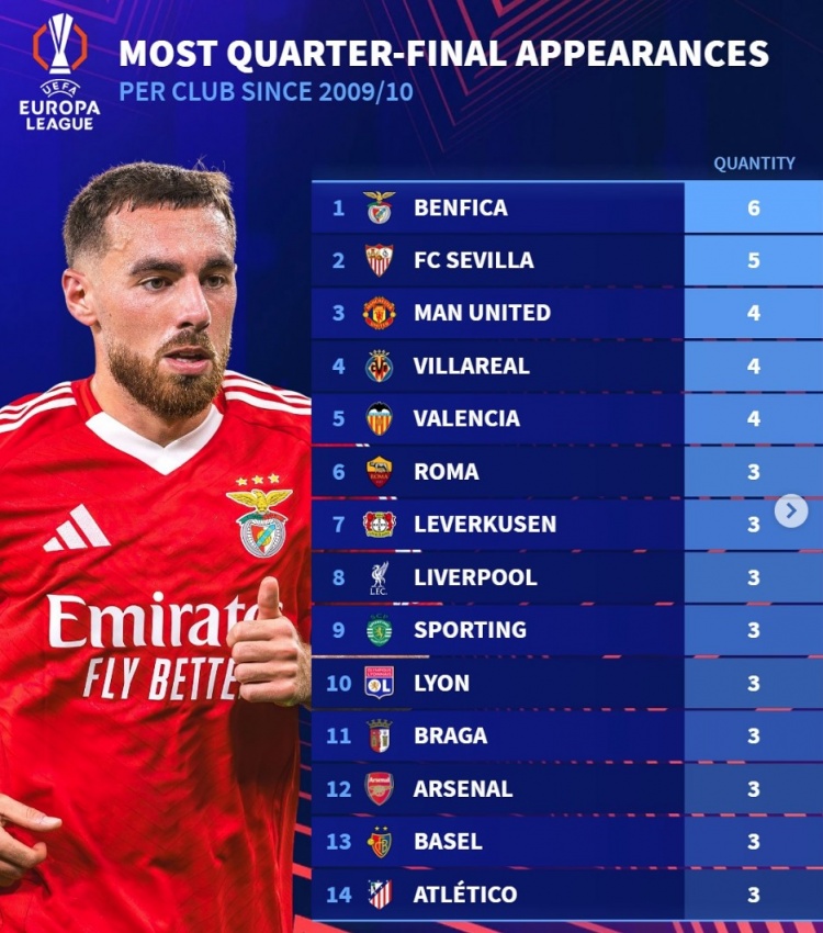 歐聯(lián)改制后晉級八強次數榜:塞維利亞5次、曼聯(lián)4次,軍槍競各3次