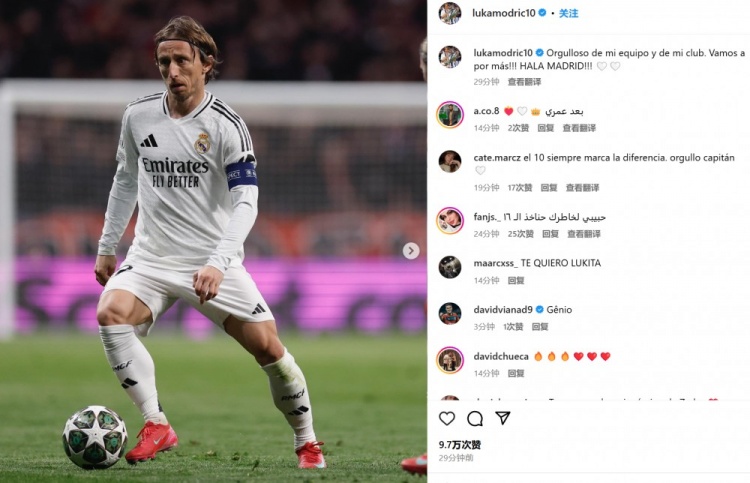 3月14日訊 皇馬在本輪歐冠點(diǎn)球淘汰馬競,老將莫德里奇首發(fā)出戰并在賽后通過(guò)社媒紀念。莫德里奇曬出自己的比賽照并配文:“我為我的球隊和俱樂(lè )部感到驕傲。讓我們繼續贏(yíng)得更多?。?!馬德里前進(jìn)?。?!”39歲的莫