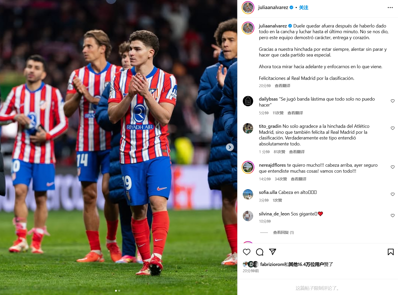 03月14日訊 歐冠16強對決,馬競在點(diǎn)球戰不敵皇馬,阿爾瓦雷斯點(diǎn)球戰點(diǎn)球罰進(jìn)但因二次觸球被判無(wú)效。阿爾瓦雷斯如今在社媒發(fā)文談到感想?!霸趫?chǎng)上拼盡全力、戰斗到最后一刻卻仍被淘汰出局,這令人心痛。雖然結