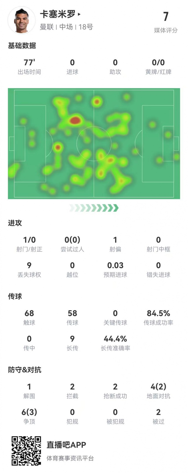 卡塞米羅本場(chǎng)11對抗6成功 3搶斷2攔截+4成功長(cháng)傳 獲評7.0分