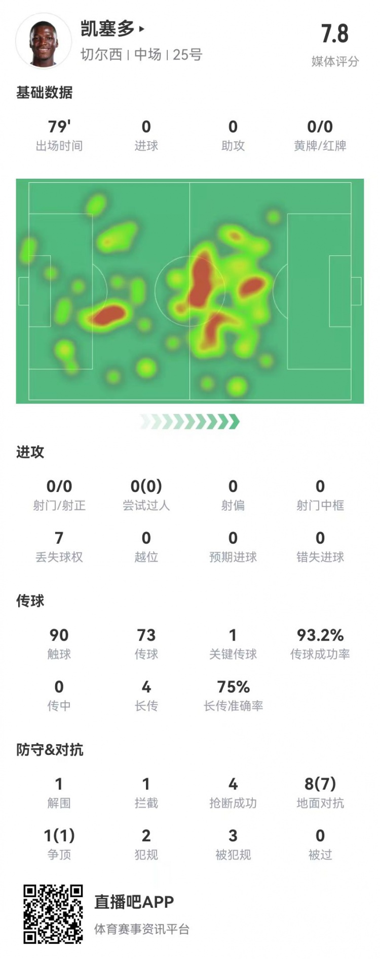 凱塞多本場(chǎng)9對抗8成功+4搶斷3造犯規 3成功長(cháng)傳 獲評7.8分