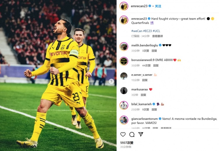 3月13日訊 多特在本輪歐冠2-1擊敗里爾,埃姆雷-詹點(diǎn)射為球隊扳平比分。第54分鐘,吉拉西造點(diǎn),埃姆雷-詹主罰點(diǎn)球,騙過(guò)門(mén)將打中路得手。埃姆雷-詹也在賽后通過(guò)社媒曬出了自己的怒吼慶祝照,并配文:“全