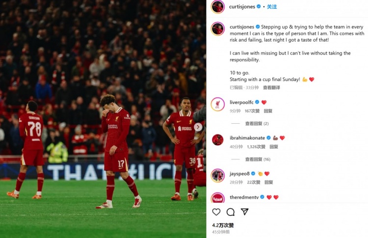 3月12日訊 利物浦在本輪歐冠焦點(diǎn)戰主場(chǎng)被巴黎點(diǎn)球淘汰,柯蒂斯-瓊斯替補登場(chǎng)罰丟點(diǎn)球。點(diǎn)球大戰第3輪,瓊斯主罰點(diǎn)球被多納魯馬摁在身下,總比分利物浦2-4巴黎。瓊斯也在今日通過(guò)社媒發(fā)文:“我總是會(huì )盡我所