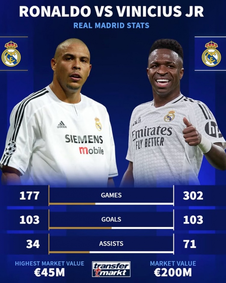 已是傳奇!大羅皇馬生涯177場(chǎng)103球34助,維尼修斯302場(chǎng)103球71助