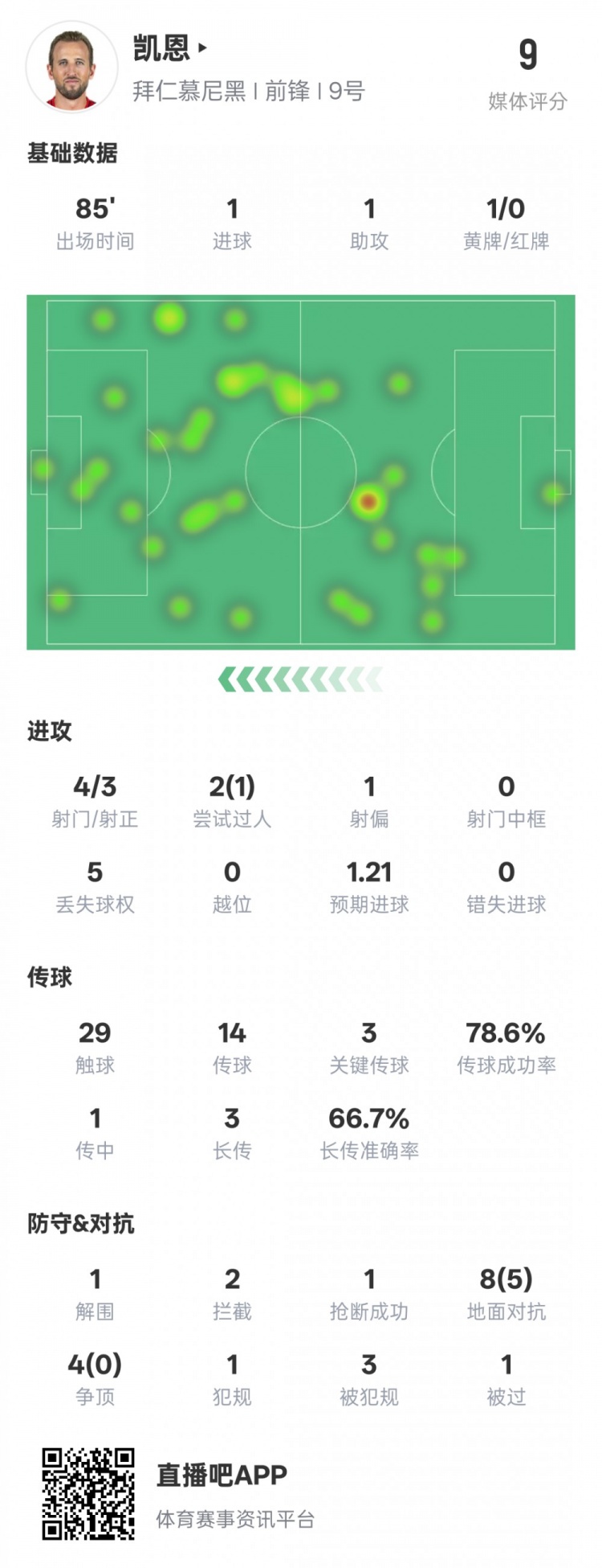 凱恩本場(chǎng)數據:傳射建功+3關(guān)鍵傳球1過(guò)人成功,評分9.0