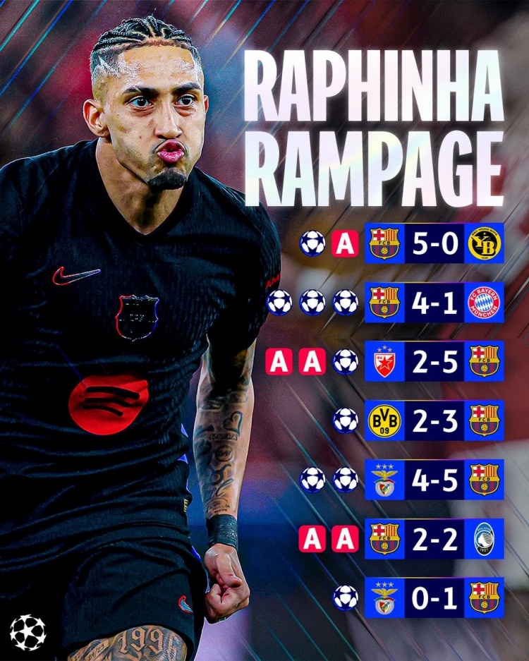拉菲尼亞單賽季歐冠參與16球是巴西第二人,巴薩隊史僅次12年梅西
