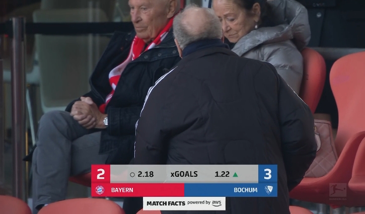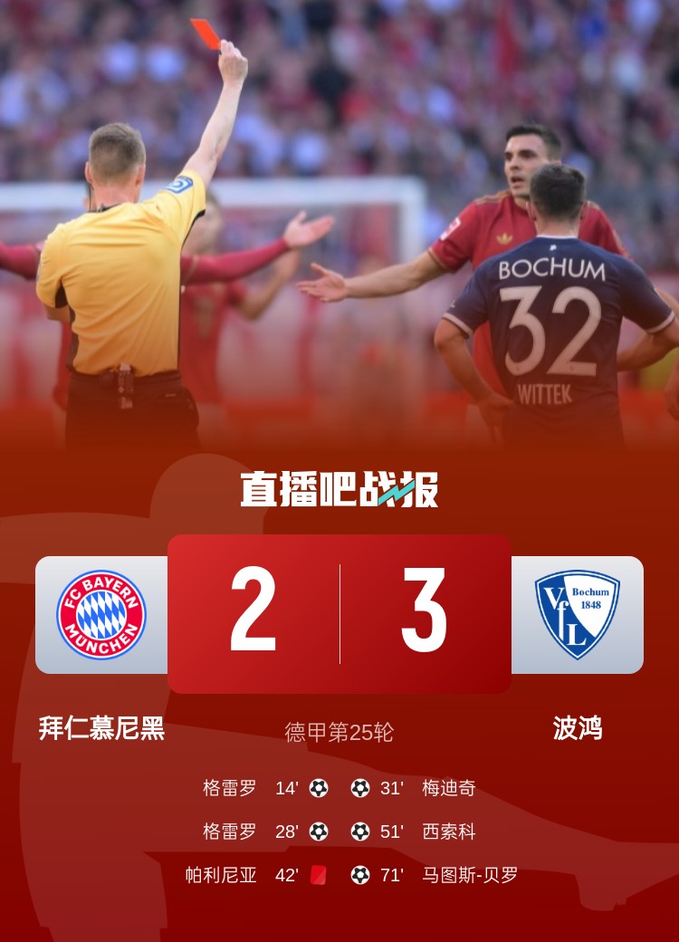 拜仁2-3波鴻全場(chǎng)數據:射門(mén)14-8,射正5-5,控球74%-26%,紅牌1-0