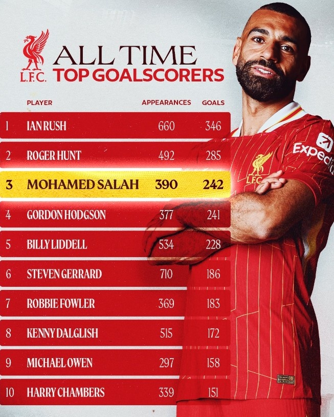 242球!薩拉赫躋身利物浦隊史射手榜第三位,僅次于拉什、亨特