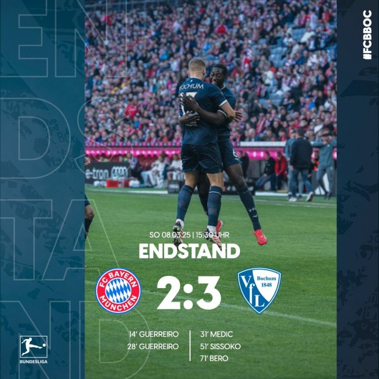 03月09日訊 德甲第25輪,拜仁2-3波鴻,勒沃庫森0-2不萊梅,多特0-1奧格斯堡,基爾2-2斯圖加特,沃爾夫斯堡1-1圣保利。德甲積分榜↓