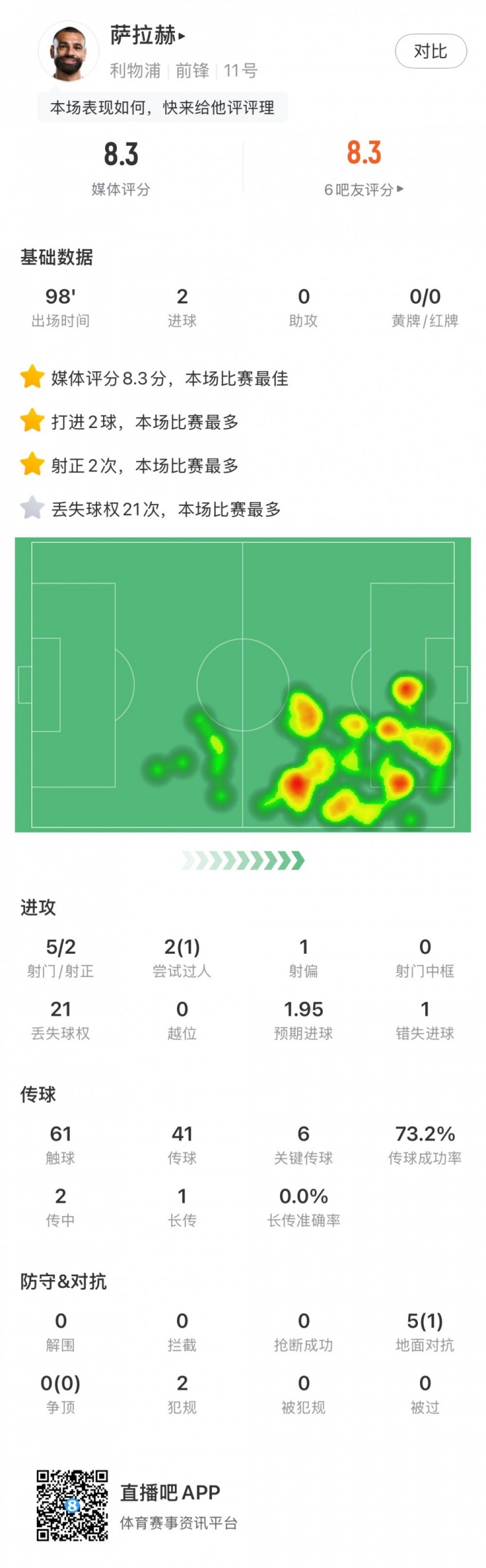 薩拉赫全場(chǎng)數據:評分8.3全場(chǎng)最高,梅開(kāi)二度&關(guān)鍵傳球6次