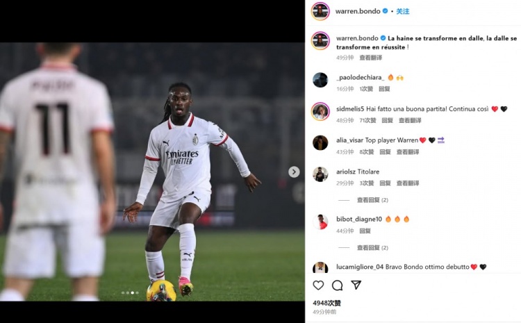3月9日訊 米蘭在本輪意甲3-2逆轉擊敗萊切,冬窗新援邦多首發(fā)出戰。邦多在冬窗以1000萬(wàn)歐元從蒙扎加盟后,因傷休戰至今,他也在本場(chǎng)比賽完成了米蘭首秀。邦多也在賽后通過(guò)社媒曬出自己的比賽照,并配文:“