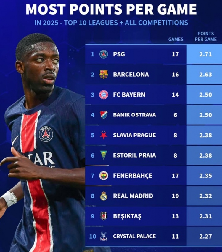2025年各項賽事場(chǎng)均拿分榜:巴黎巴薩拜仁前三,皇馬費內巴切在列