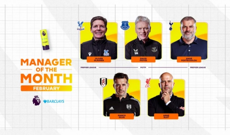 3月6日訊 英超官方公布2月最佳教練候選,格拉斯納、莫耶斯、波斯特科格魯、馬爾科-席爾瓦、斯洛特5名教練獲提名。英超2月最佳教練候選:格拉斯納(水晶宮):4戰3勝1負,凈勝球+6莫耶斯(埃弗頓):5戰