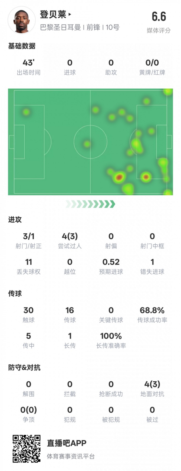 登貝萊半場(chǎng)數據:3過(guò)人成功11次丟失球權&錯失1進(jìn)球機會(huì ),評分6.6