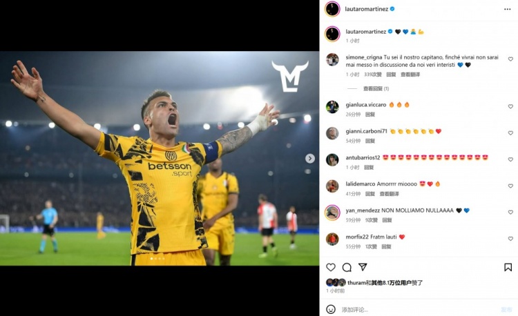鋒線(xiàn)雙星雙雙破門(mén),勞塔羅&小圖拉姆社媒曬怒吼慶祝照