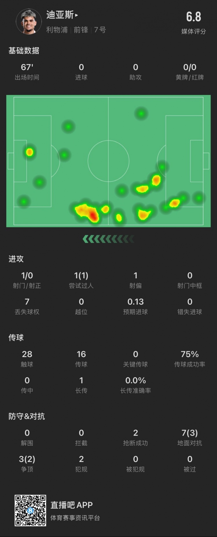 迪亞斯本場(chǎng):1射門(mén)0射正,貢獻2搶斷,10次對抗成功5次,犯規2次