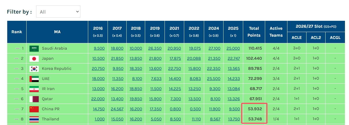 恐遭反超!海港輸球、武里南聯(lián)平,泰國技術(shù)分僅落后中國0.184分