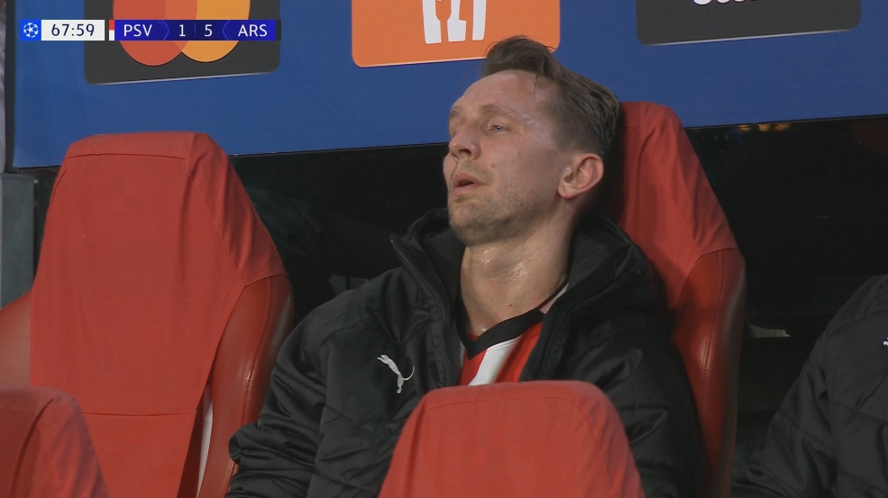 盧克-德容被換下后癱在替補席3月5日訊 歐冠1/8決賽首回合,埃因霍溫主場(chǎng)1-7慘敗阿森納,基本終結兩回合懸念。賽后,埃因霍溫隊長(cháng)盧克-德容接受Ziggo Sport采訪(fǎng)?!懊總€(gè)人都看得到,對手最大限