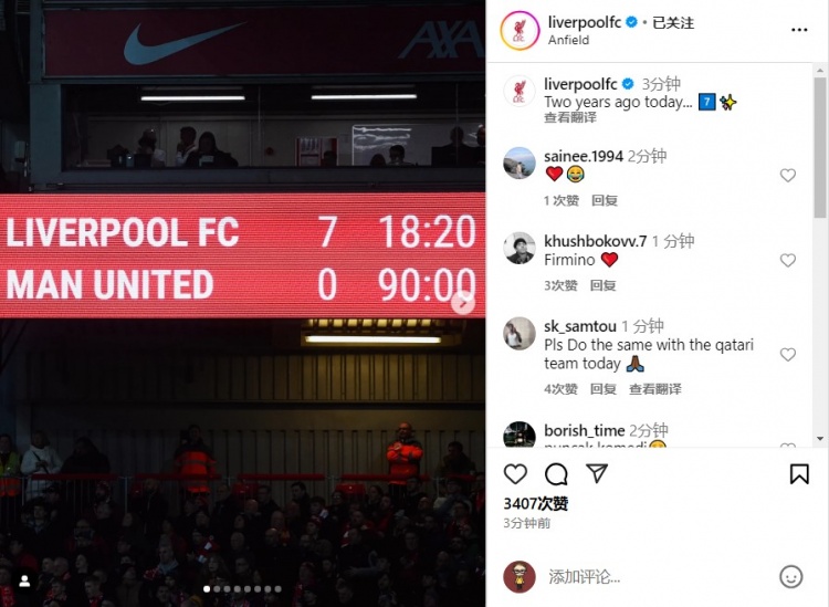 3月5日訊 今天是利物浦7-0曼聯(lián)兩周年紀念日,利物浦官方Instagram發(fā)文回顧。2023年3月5日,利物浦在英超聯(lián)賽中主場(chǎng)7-0大勝曼聯(lián),加克波、薩拉赫、努涅斯梅開(kāi)二度,菲爾米諾破門(mén)。