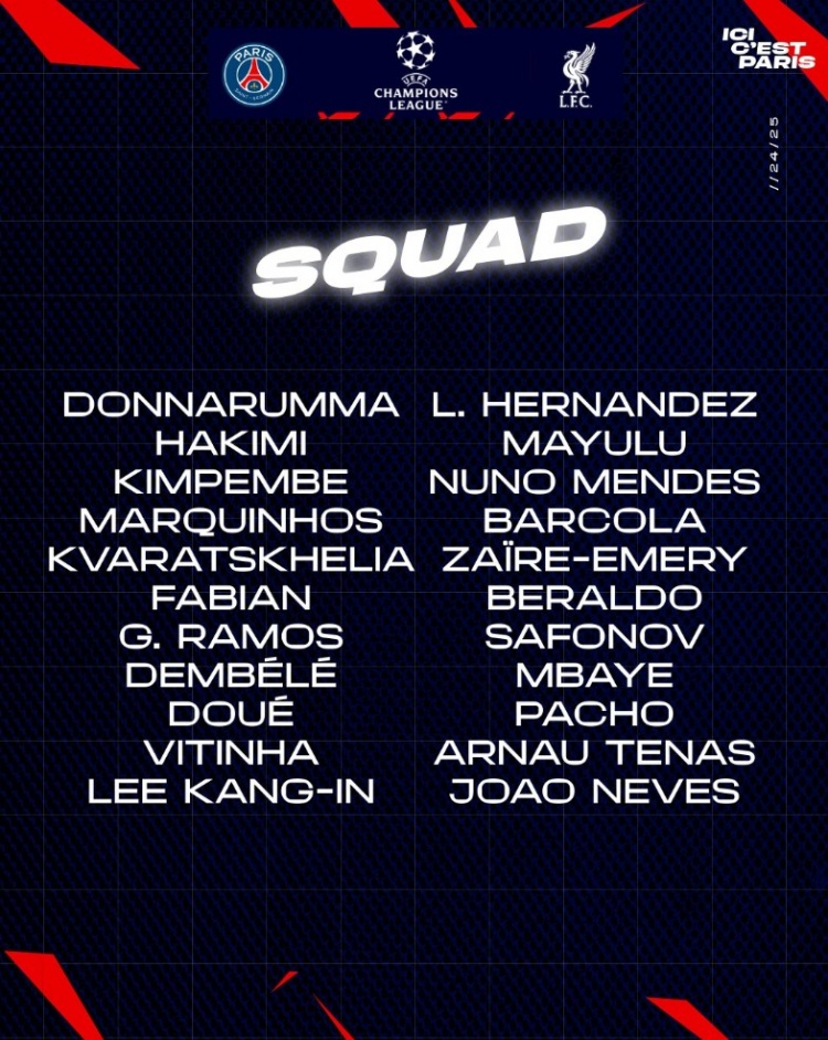 巴黎對陣利物浦大名單:登貝萊領(lǐng)銜鋒線(xiàn),馬爾基尼奧斯坐鎮后防