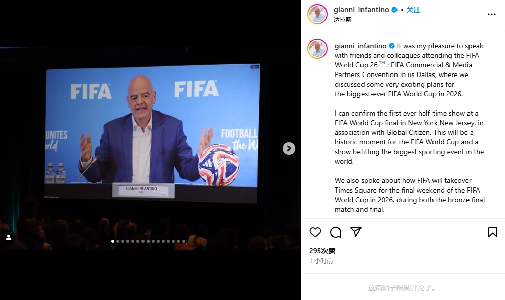 變成超級碗?因凡蒂諾:26年世界杯決賽有中場(chǎng)表演,酷玩樂(lè )隊參與