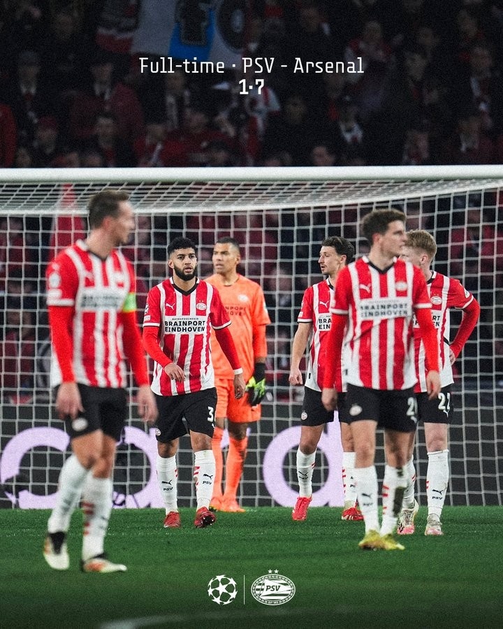 阿森納上次歐冠打進(jìn)7球還是07年,埃因霍溫遭遇隊史歐冠最慘失利